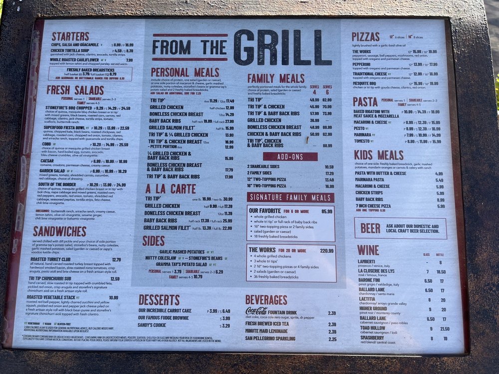 choice of: Chicken Tortilla Soup, Garden Salad, Caesar Salad, Garlic Mashed Potatoes, Nutty Coleslaw, Stonefire's Beans, or Potato Salad.