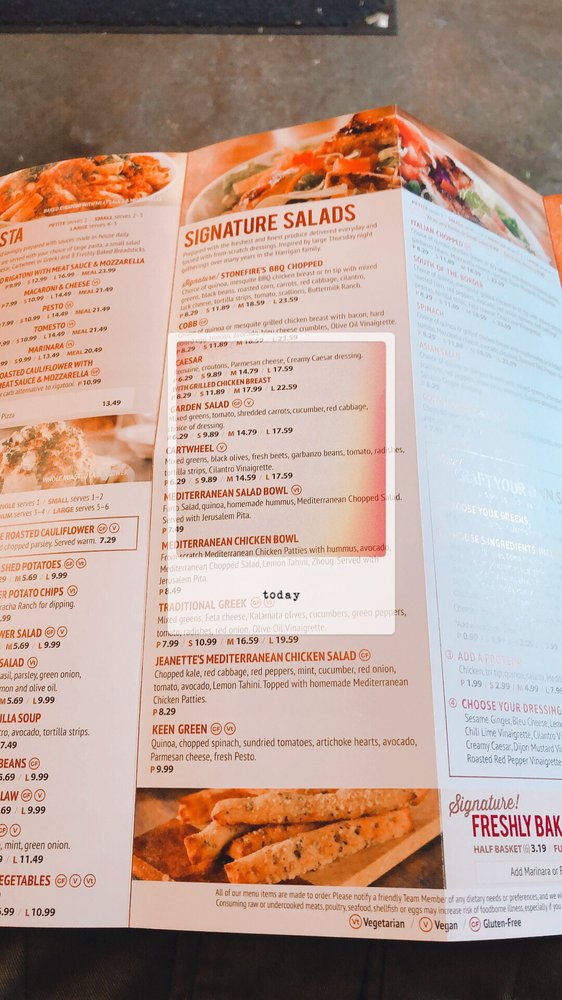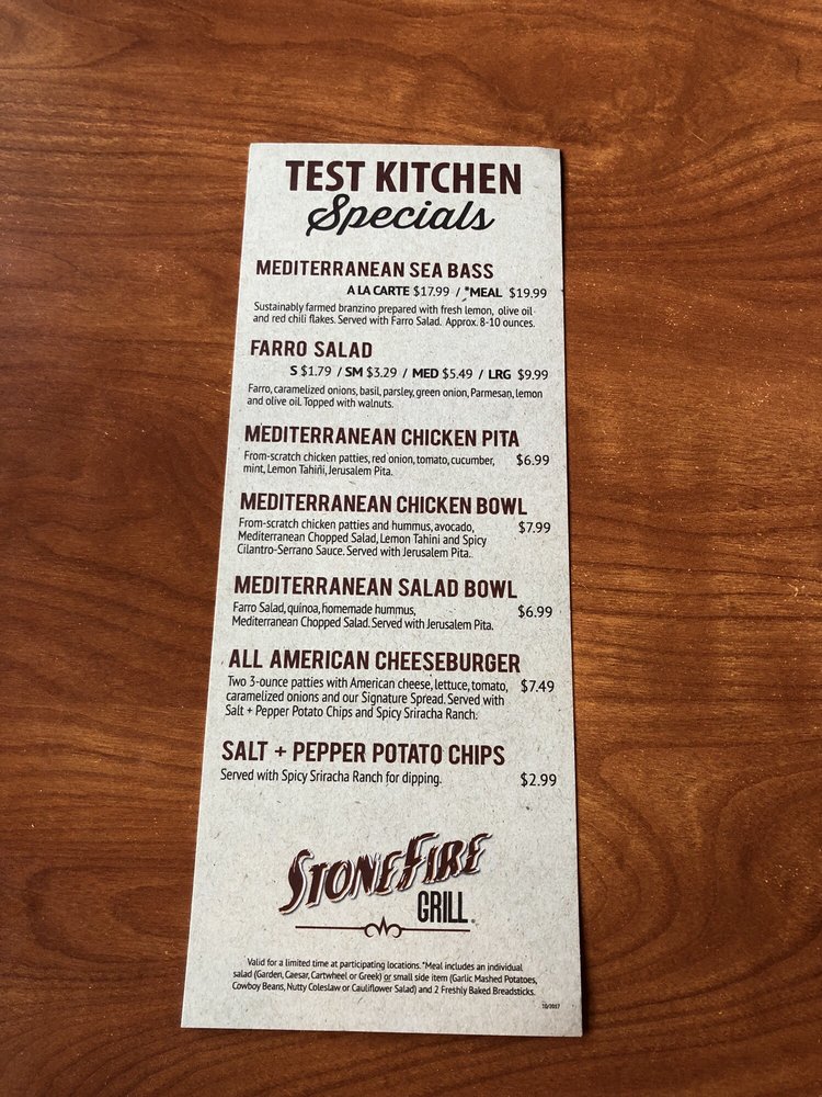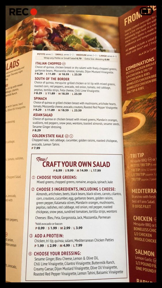 Personal Salad Choices: Stonefire's BBQ Chopped Bleu Cheese Wedge Superfood Fiesta Bowl Cobb Caesar Garden South Of The Border Italian Chopped Cartwheel