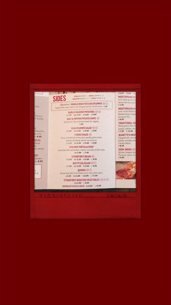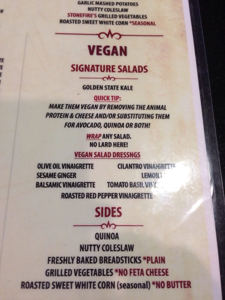 Shareable Side Choices: Garlic Mashed Potatoes Creamed Corn Nutty Coleslaw Stonefire's Beans Potato Salad Roasted Vegetables